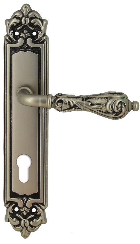 Дверная ручка Extreza "GRETA" (Грета) 302 на планке PL02 старинное серебо матовое + черный F64 под цилиндровый механизм CYL