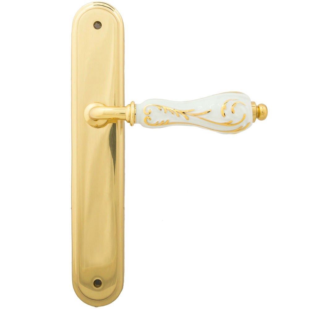 Дверная ручка изготавливается из латуни, в цвете латунь полированная с керамической вставкой, выполнена в стиле классики.