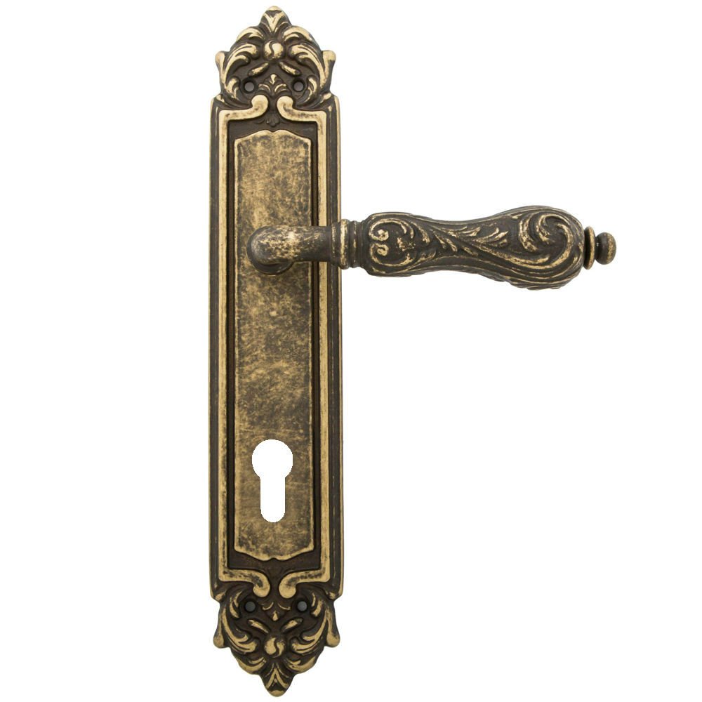 Дверная ручка изготавливается из латуни, в цвете античная бронза, выполнена в стиле классики.