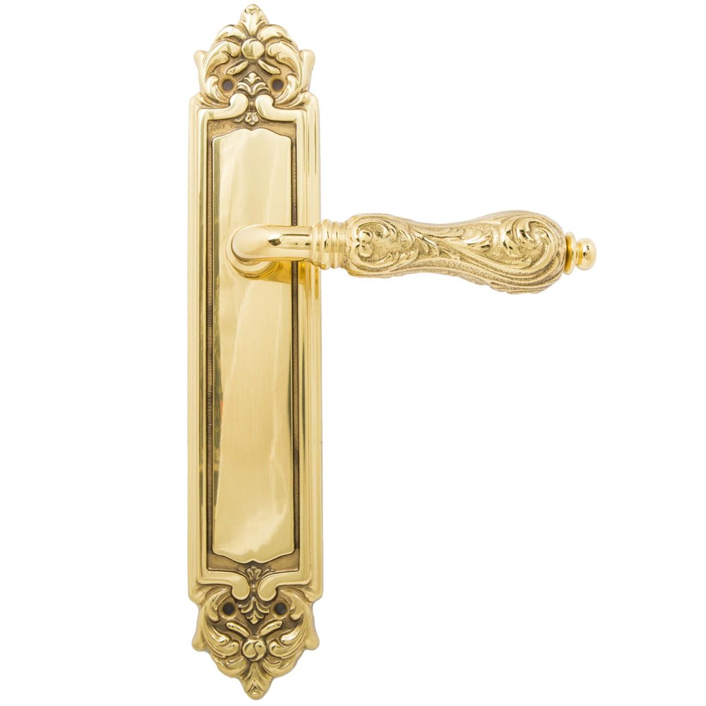 Дверная ручка изготавливается из латуни, в цвете полированная латунь, выполнена в стиле классики.