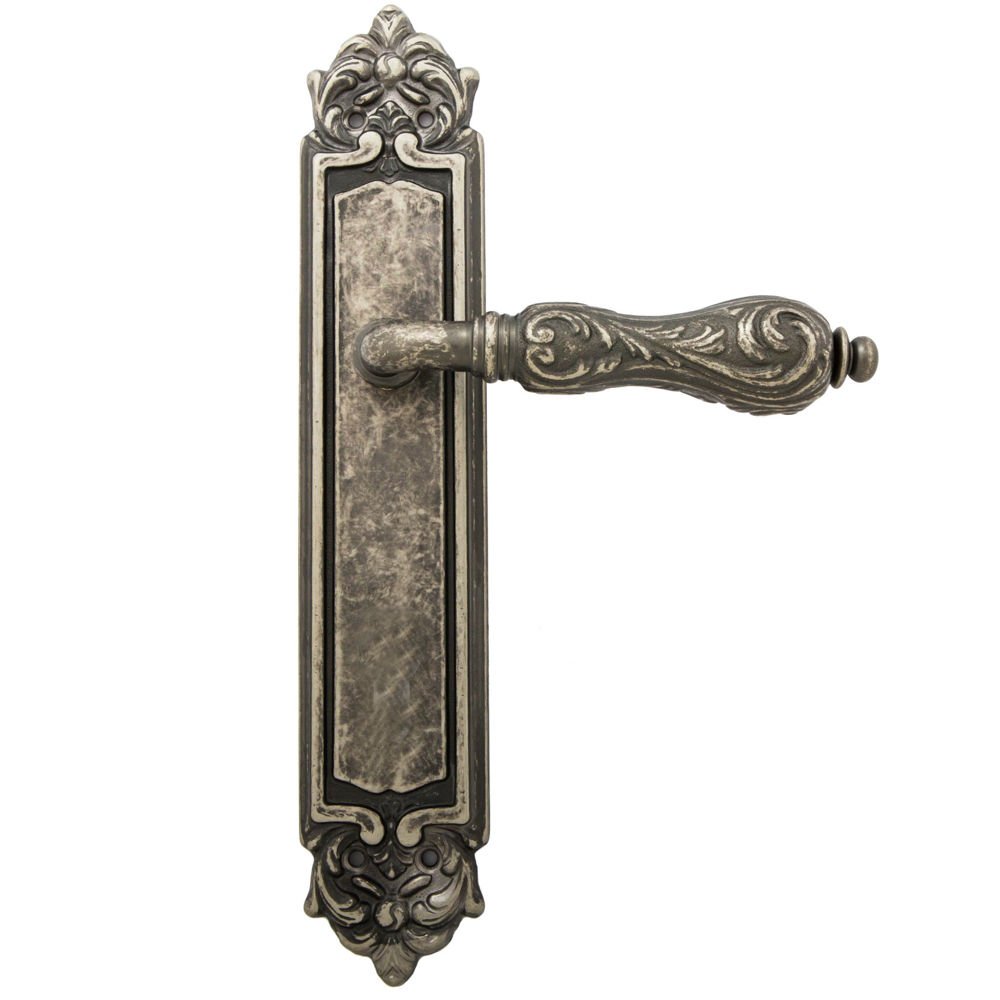 Дверная ручка изготавливается из латуни, в цвете античное серебро, выполнена в стиле классики.