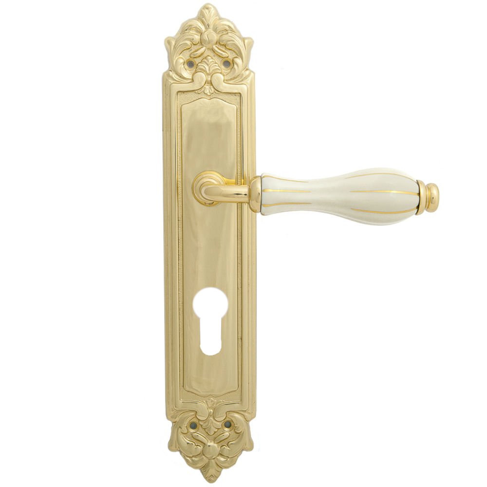 Дверная ручка изготавливается из латуни, в цвете блестящая латунь с керамической вставкой, выполнена в стиле классики.
