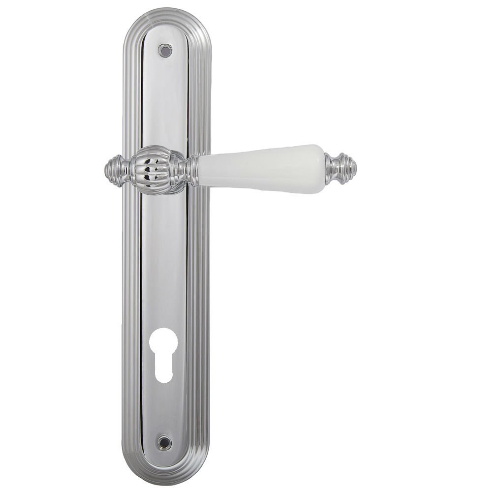 Дверная ручка изготавливается из латуни, в цвете хром полированный с белой керамической вставкой, выполнена в стиле классики.