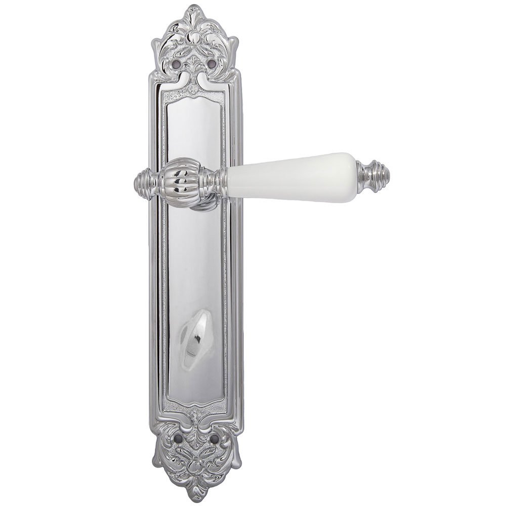 Дверная ручка изготавливается из латуни, в цвете хром полированный с белой керамической вставкой, выполнена в стиле классики.