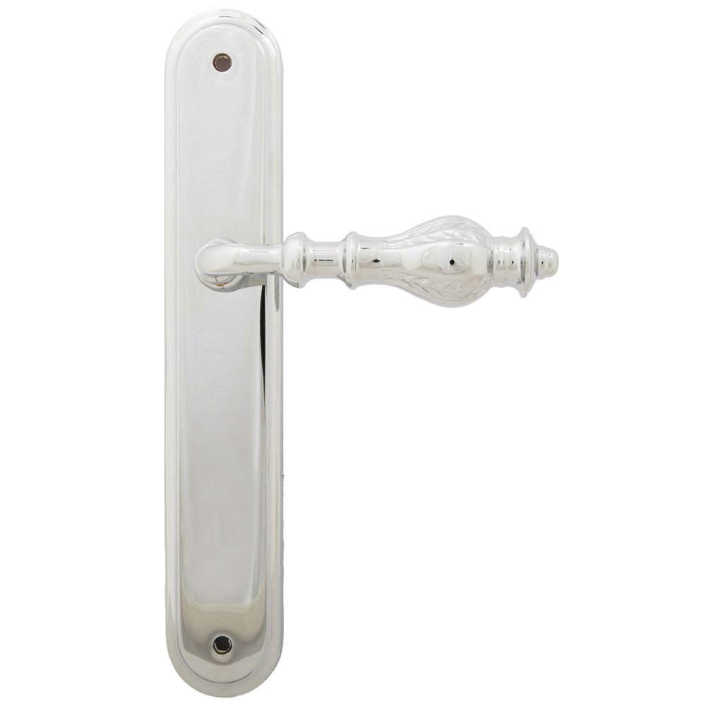 Дверная ручка изготавливается из латуни, в цвете хром полированный, выполнена в стиле классики.