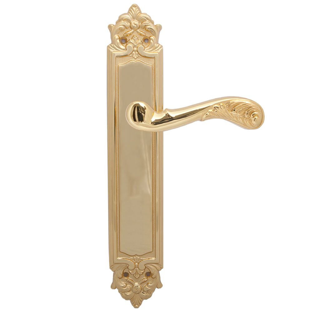 Дверная ручка изготавливается из латуни, в цвете золото 24К, выполнена в стиле классики.
